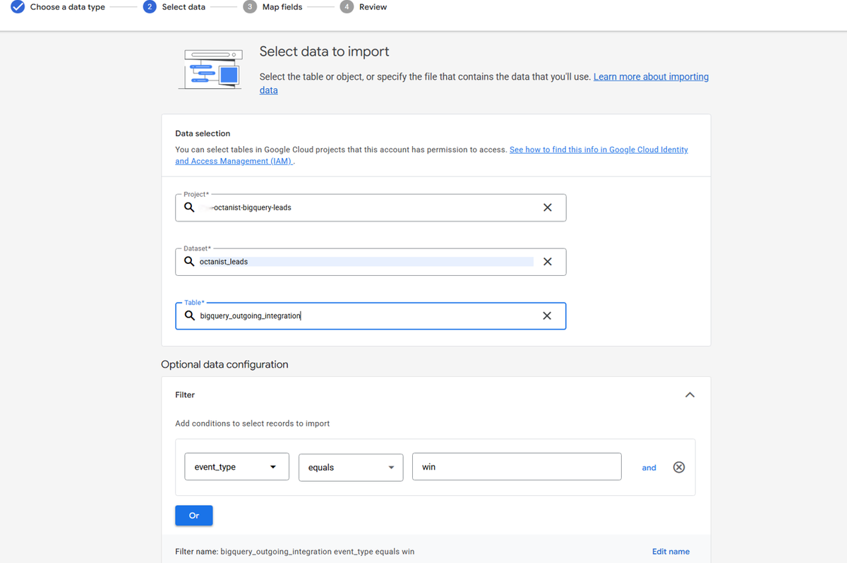 Choose the data type “Emails, phone numbers and/or mailing addresses.” Then select the project, dataset, and table where your Octanist data is stored in BigQuery. Select the field event_type (status) and filter for “win” to include only your won leads.