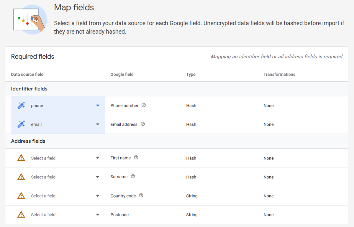 Next, map your fields. Match the email and phone fields from BigQuery to the corresponding fields in Google Ads. You can optionally map first name, last name, country code, and postal code if available, though email and phone are usually sufficient for accurate matching.