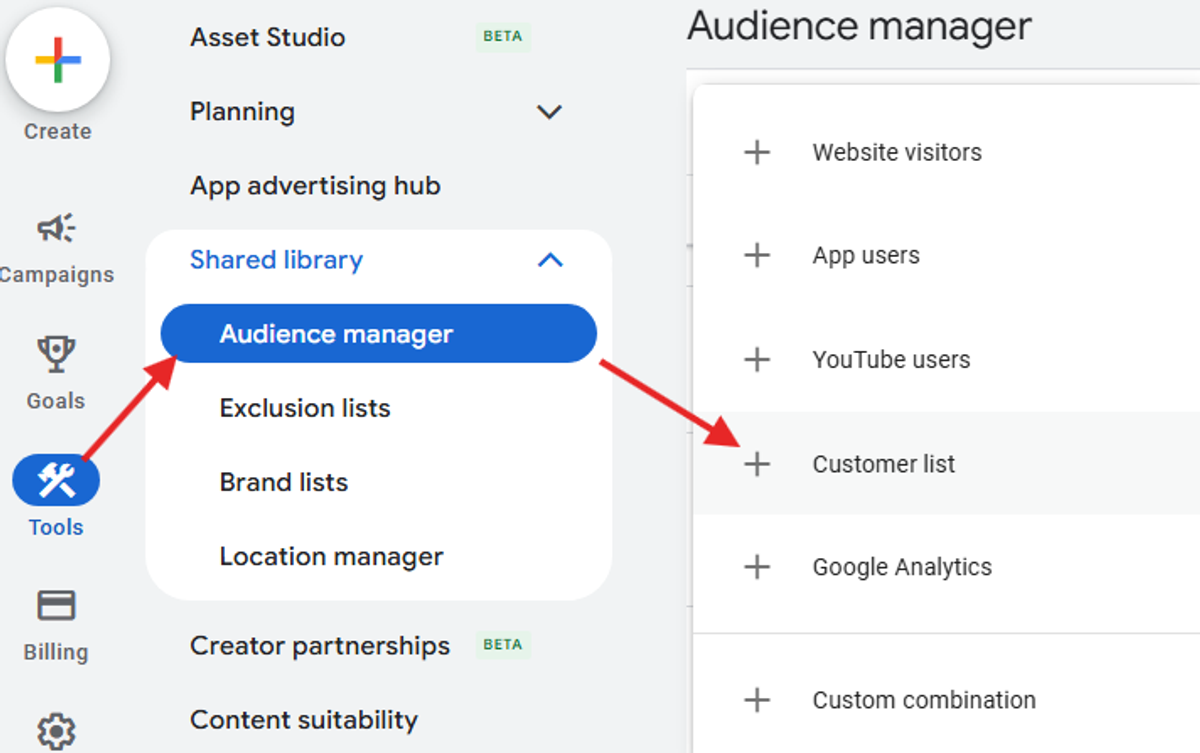 In Google Ads, go to Tools & Settings › Audience Manager, then click the plus (+) icon to add a new Customer Match List.